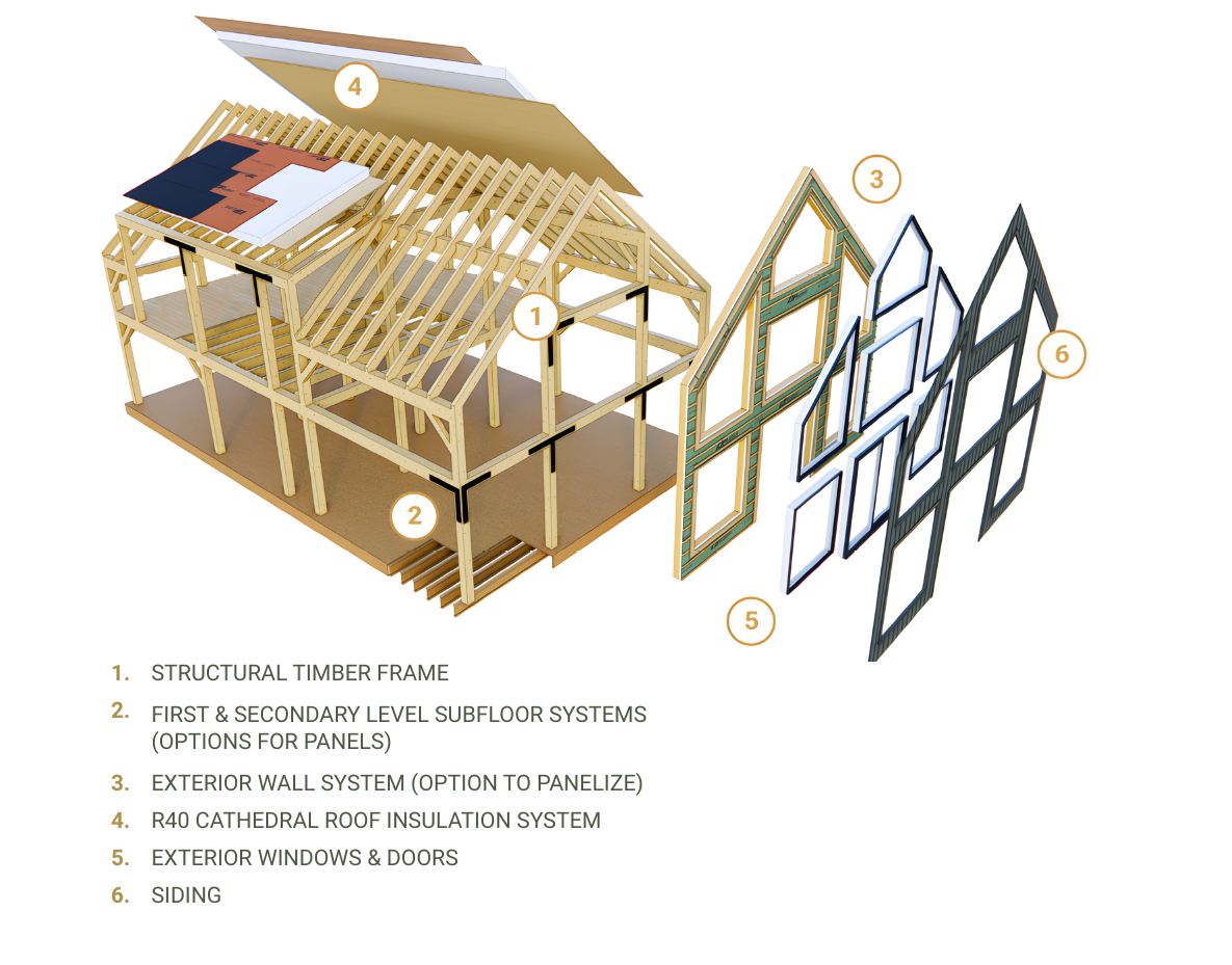 At its core, it typically includes the drawings, timber frame or structural wood package, framing package, and selected building envelope components required for the shell. From there, optional enhancements such as panelized wall systems or factory finishing can be added to suit the goals of the project.